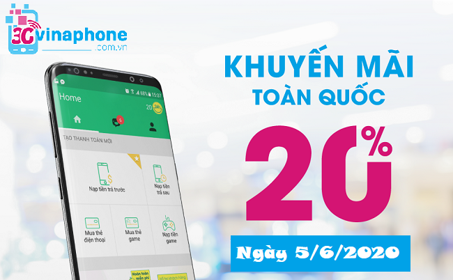 Hãy cùng tham gia chương trình VinaPhone khuyến mãi 20% Toàn Quốc ngày 5/6/2020 để mang về nguồn tài khoản di động thật dồi dào bạn nhé!